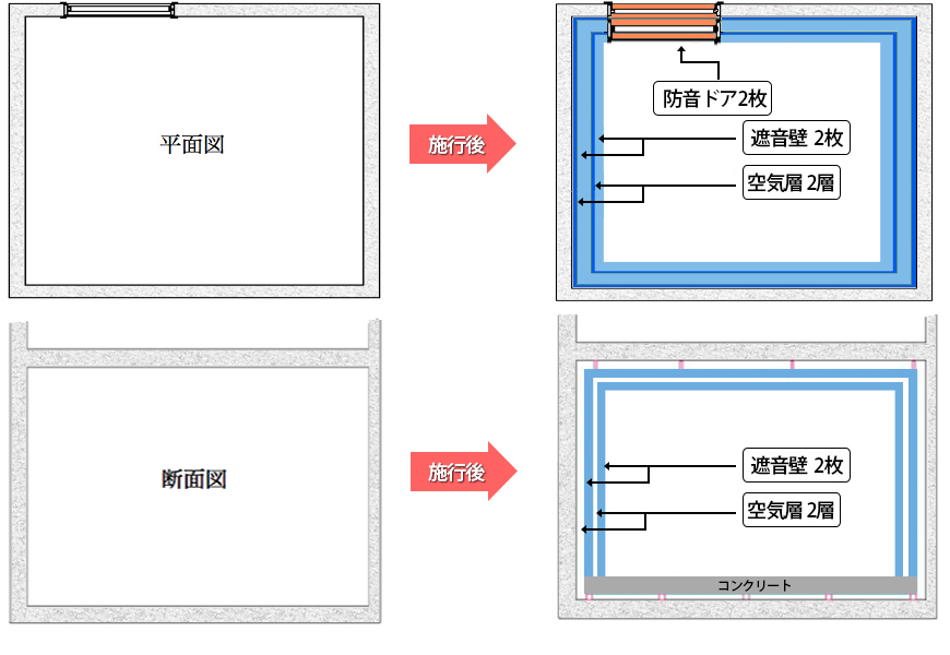 天井、壁、床共に浮遮音壁を設置し、建物の躯体に直接音が入射しにくい設計で施工を実施いたします。防音ドアは2枚設置、窓がある場合は完成に塞ぎます。尚24時間対応の場合は性能を高くするため場合によってはRC、ブロックを使用して遮音壁を設置し防音ドアは鋼製ドアを2枚設置いたします。