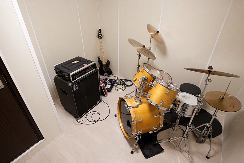ドラム防音室では、周波数帯域が非常に広いと同時に低周波による振動対策が必要となります。尚、マンションでのドラム防音室は非常に困難を要するため当社ではご遠慮いただいております。